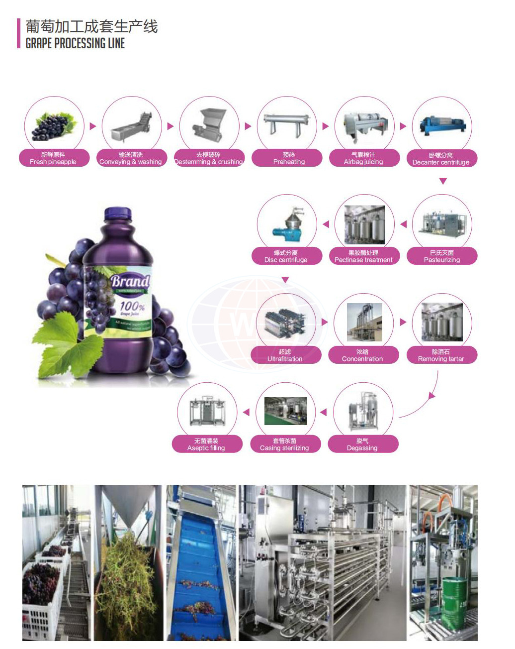 Le raisin frais est nettoyé, sélectionné, cassé, jus et séparé de la fibre de pulpe pour obtenir du jus frais sans pulpe. Ce processus est effectué automatiquement par machine à grande efficacité.